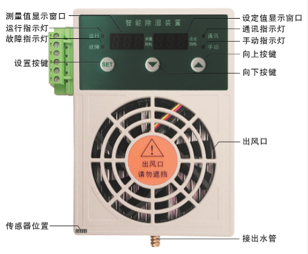 2、自动除湿功能:当除湿器通过配套高精度湿度传感器测量到湿度大于设置值时,除湿功能自动启动,同时运行指示灯开启,当测量湿度低于设置湿度值减去10RH%回差,除湿功能自动停止,同时运行指示灯关闭。